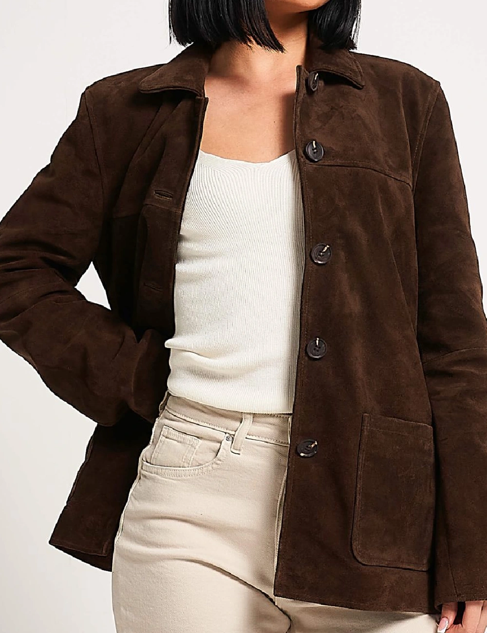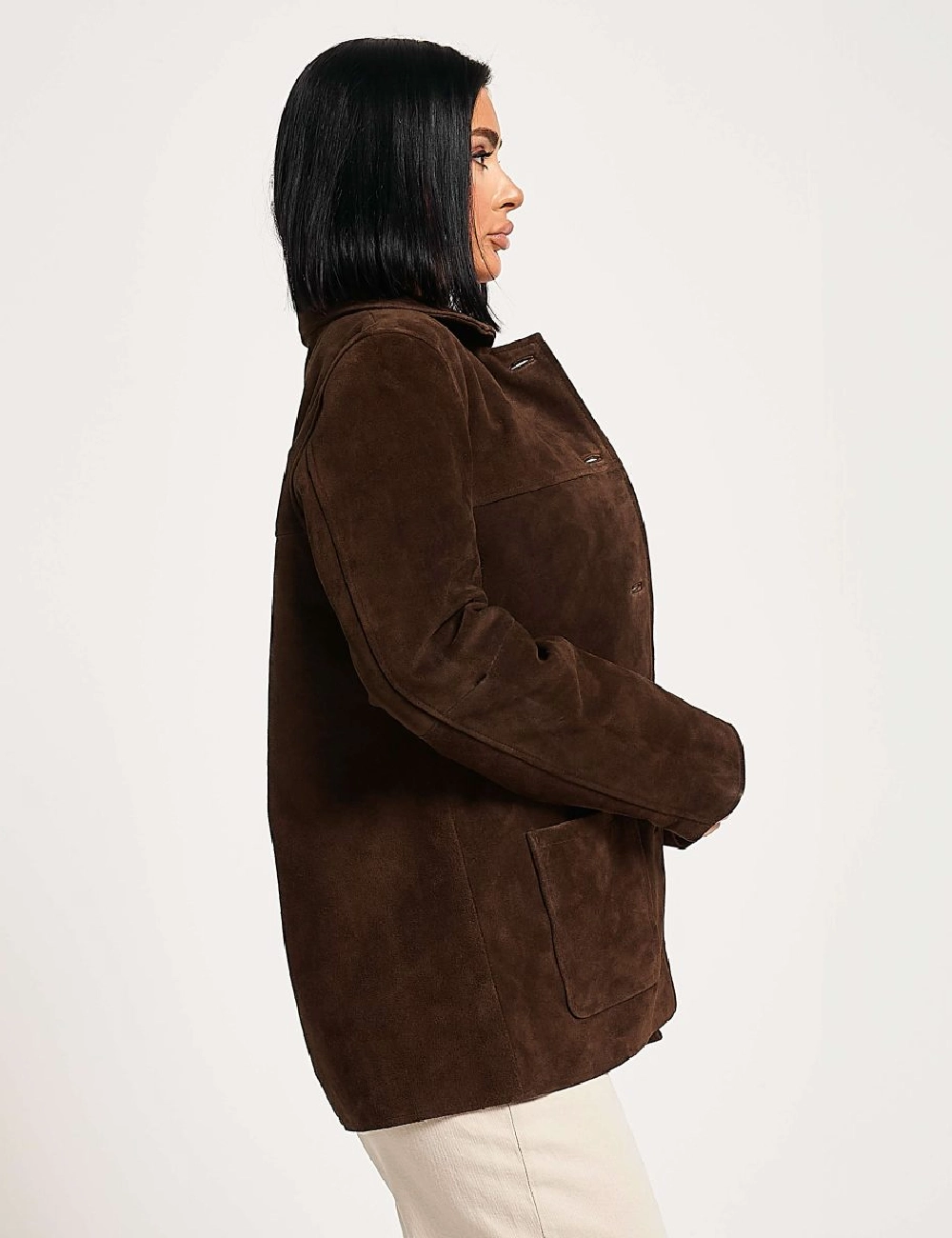 - Classic button-up closure adds timeless charm to this suede outerwear.